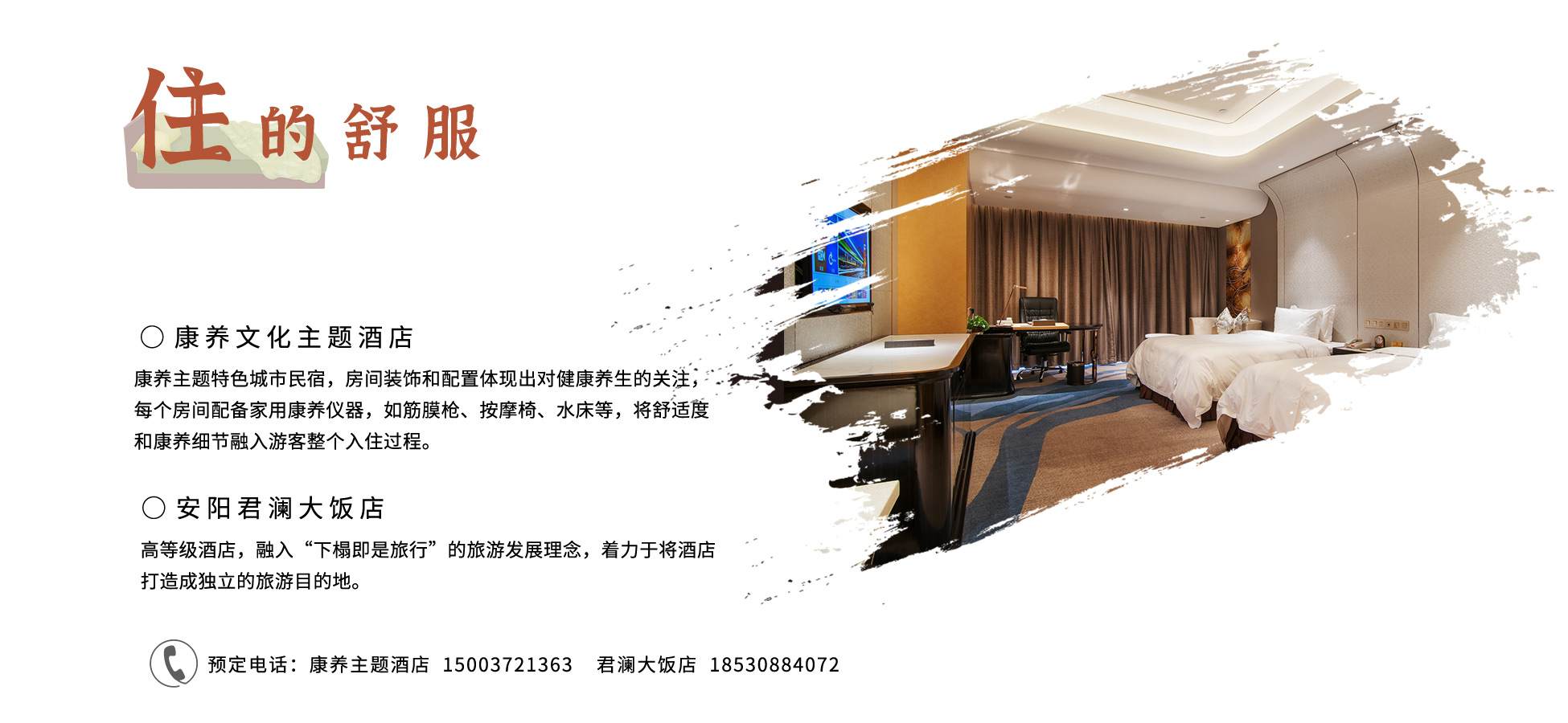 酒店提供艾灸康體室、水療按摩室、音樂(lè )冥想室等特色康養體驗及養生茶等特色康養餐品,多角度展示康養文化,并配備多種家用康養器材以及各類(lèi)康養教程,方便住客進(jìn)行八段錦、瑜伽等指導性康養運動(dòng),以此打造安陽(yáng)市精品康養特色的酒店品牌。